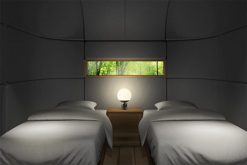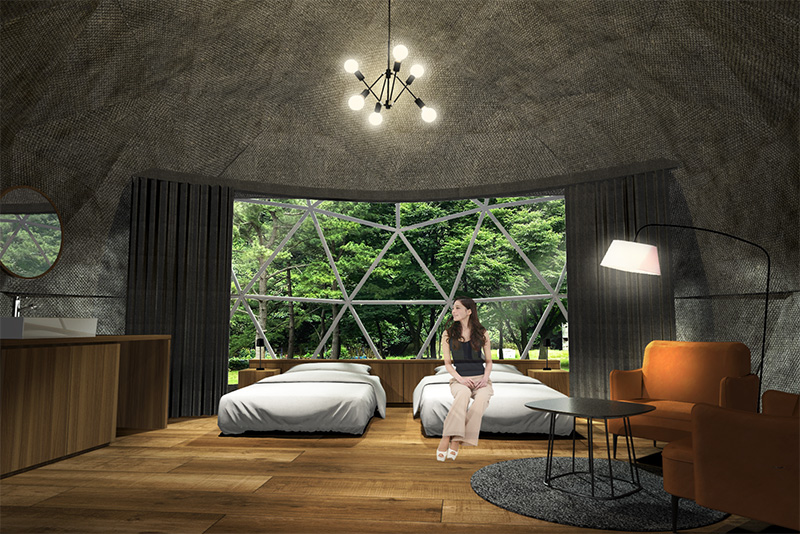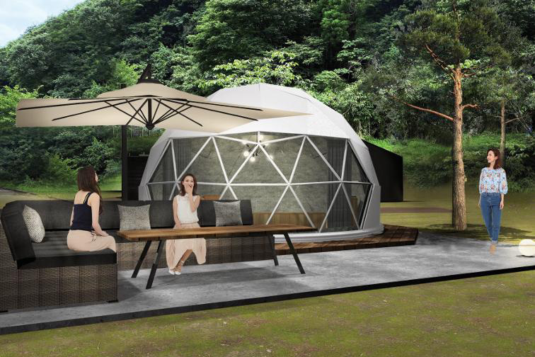 Sanatonのグランピング棟は、6mの広々としたドーム型テントに、清潔で使いやすい専用サニタリールームを備えた、